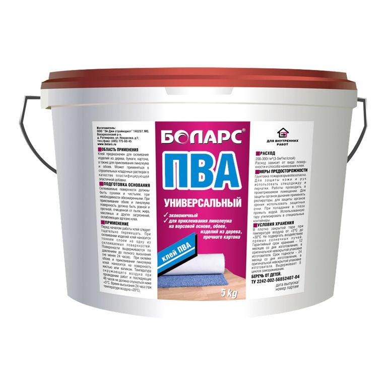 Клей БОЛАРС ПВА «Универсальный» предназначен для приклеивания на впитывающие основания гетерогенного линолеума, ковролина, паркета, обоев, бумаги, картона. Может применяться в качестве пластифицирующей добавки для строительных растворов.